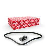 Si la courroie trapézoïdale à nervures (également appelée courroie accessoire) doit être remplacée, peut-être faut-il en profiter pour changer aussi la poulie tendeur, la poulie motrice ou la poulie roue libre. Un jeu de courroie trapézoïdale à nervures contient toutes les pièces de rechange à un prix très intéressant. Assemblés par le fabricant, ces kits vous assurent d'avoir en un seul achat toutes les pièces assorties. Vérifiez bien le contenu du kit de courroie trapézoïdale à nervures avant de commander, car ces kits sont disponibles dans différentes configurations qui ne correspondent pas toujours à votre véhicule. Vérifiez également le code moteur, qui peut varier pour un même modèle de véhicule.